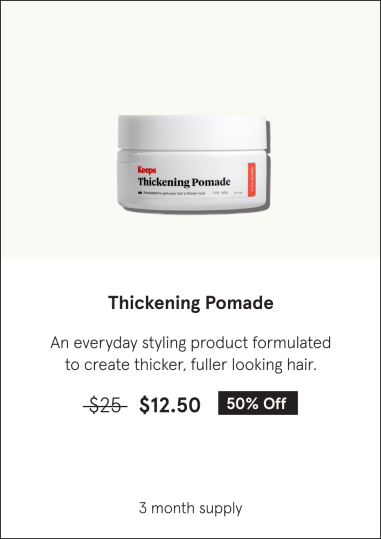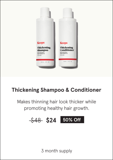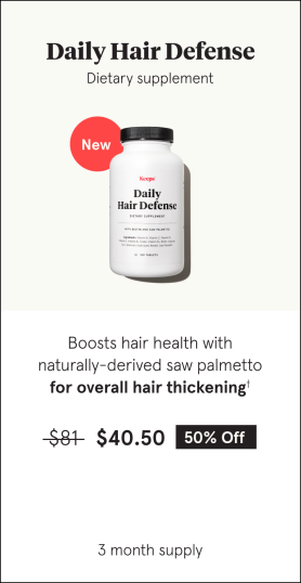 *Terms and conditions of offer: The offer “Save up to 50% off your first order when you start or add to your Keeps plan” (the “Offer”) is subject to the following conditions: (a) available to existing Keeps patients only; (b) discount only applies to first shipment; and (c) Offer available on all 3 month subscription plans except Minoxidil+ Spray and sexual health plans. If you accept the Offer, the first subscription order will be in the form of a 3-month supply and the remainder of the subscription will be refilled at the regular price every 3 months with your applicable order. After the first order, you can cancel refills at any time in accordance with Keeps’ cancellation terms. You acknowledge that prescription medications require a consultation and that a provider prescribes you medication. One Offer per person. Offer is for a limited time or while supplies last, and expires no later than 11:59pm EST on September 25th, 2025.